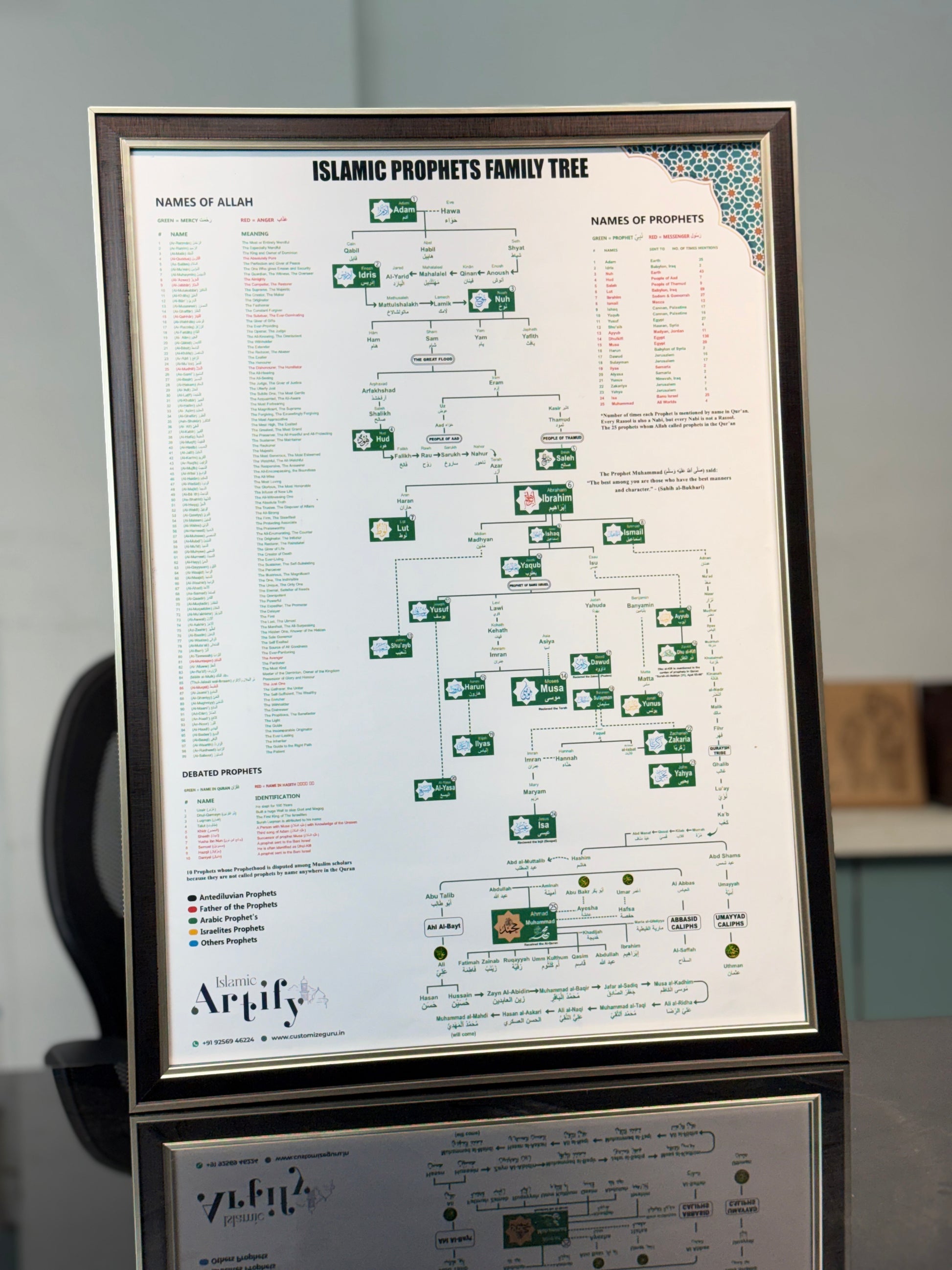 The Islamic Prophets Family Tree is a premium framed wall art showcasing the complete lineage of Prophets from Adam (AS) to Prophet Muhammad ﷺ. Designed for education and decor, it includes the Names of Prophets, Names of Allah, and clear family connections — perfect for Muslim homes, madrasas, and gifting.